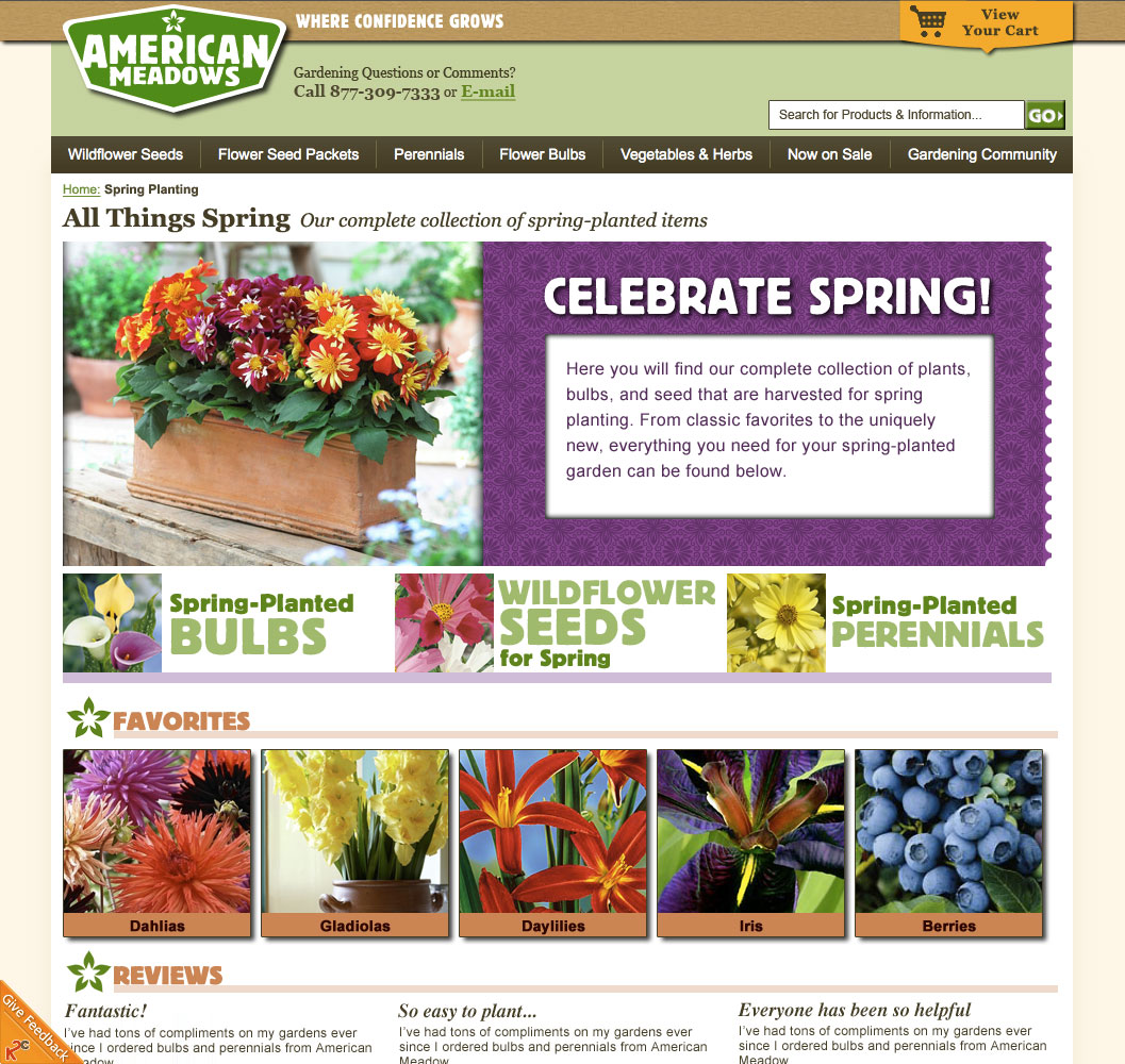 Having recently done a branding update, American Meadows needed to incorporate some of the new look into select pages on their website. This is a proposed design for a new landing page for Spring flowers.