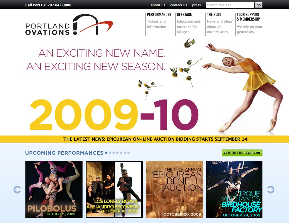 Portland's premier performing arts presenter underwent a name change and re-branding. This project involved working with designer Andrew Shuttleworth to plan the transition strategy, learning the back end of the Expression Engine content management system, writing documentation, and training the in-house content contributor to load the 2009-10 season information.